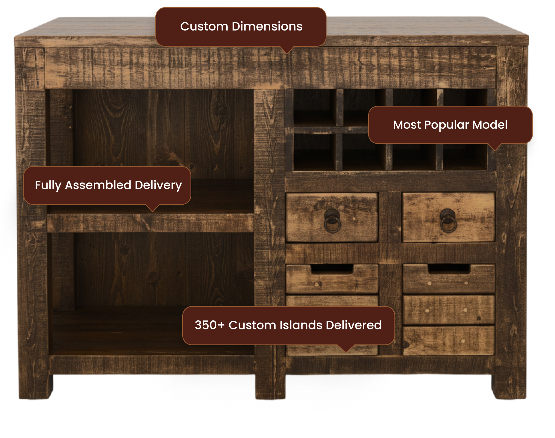 The Nevada Rustic Island is our most popular design, chosen by families across the U.S. for its timeless look and everyday functionality. But no two kitchens are the same — that’s why your island is built your way.