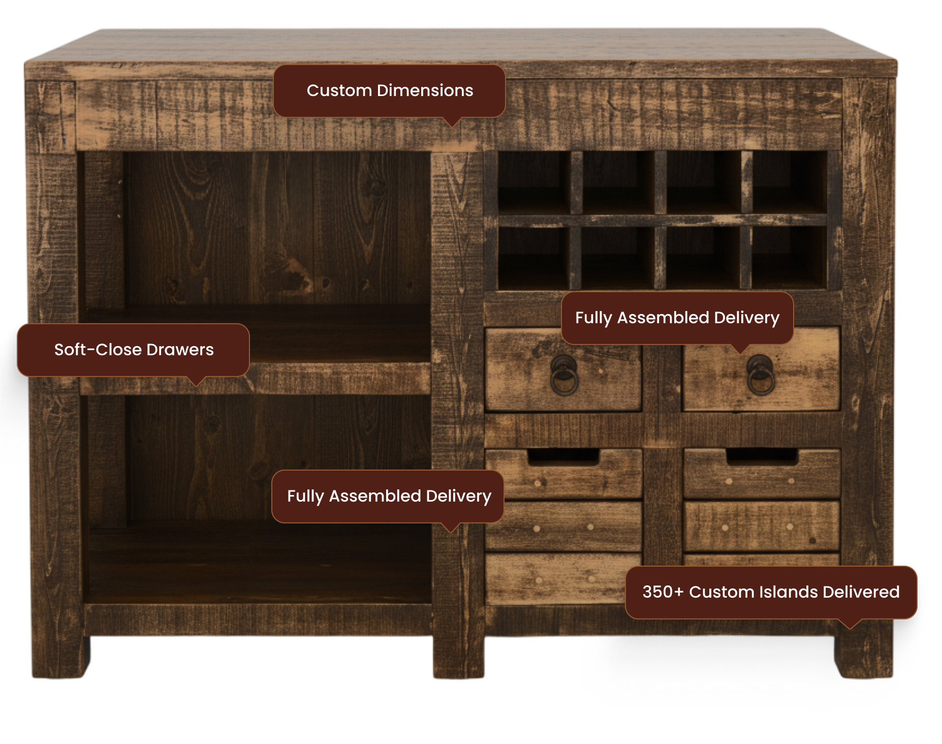 Each island is individually crafted, finished by hand, and then shipped to you from our team in Texas with the level of care a piece like this deserves.